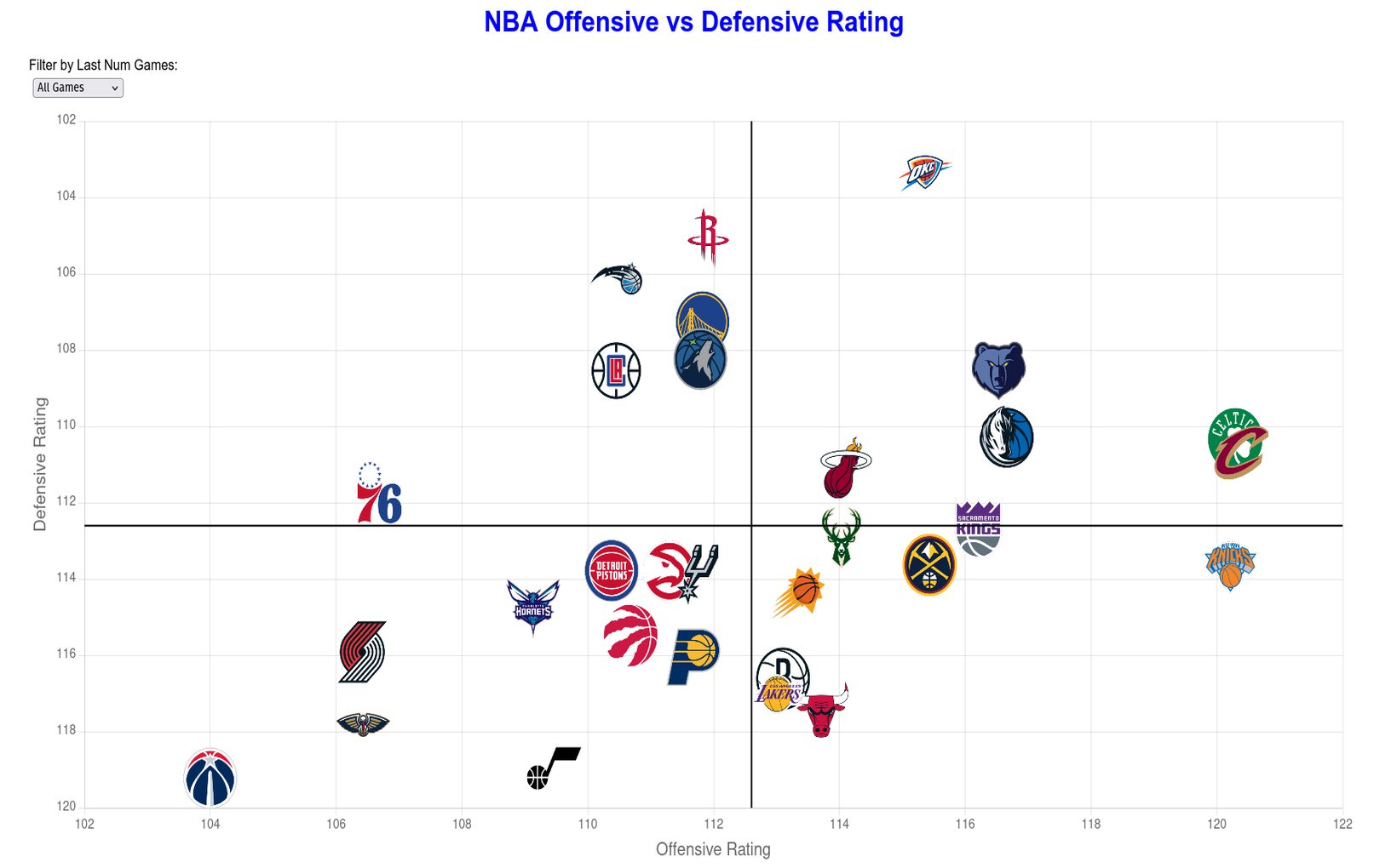 A project that utilizes the NBA API to visualize offensive and defensive rating. Using python, javascript, chart.js library, html, and css.