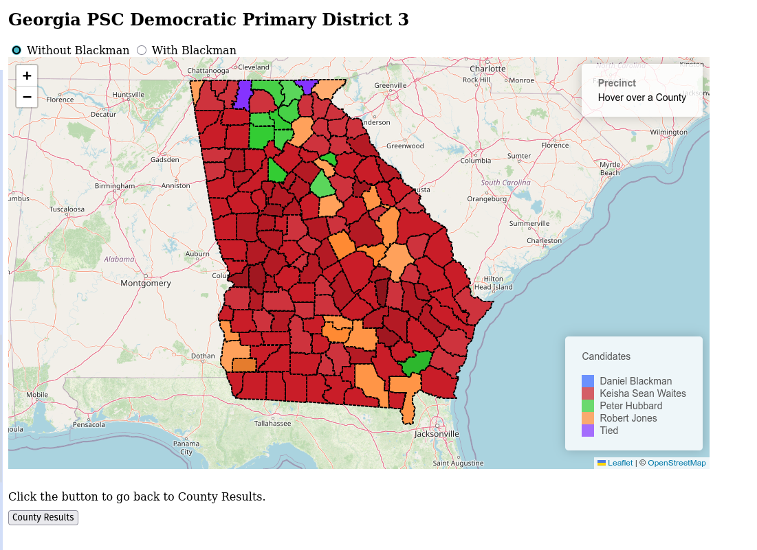 A project that summarizes an election for Public Service Commission. It utilizes cross filters and drill down functionality. It was created with javascript, html, and css.
